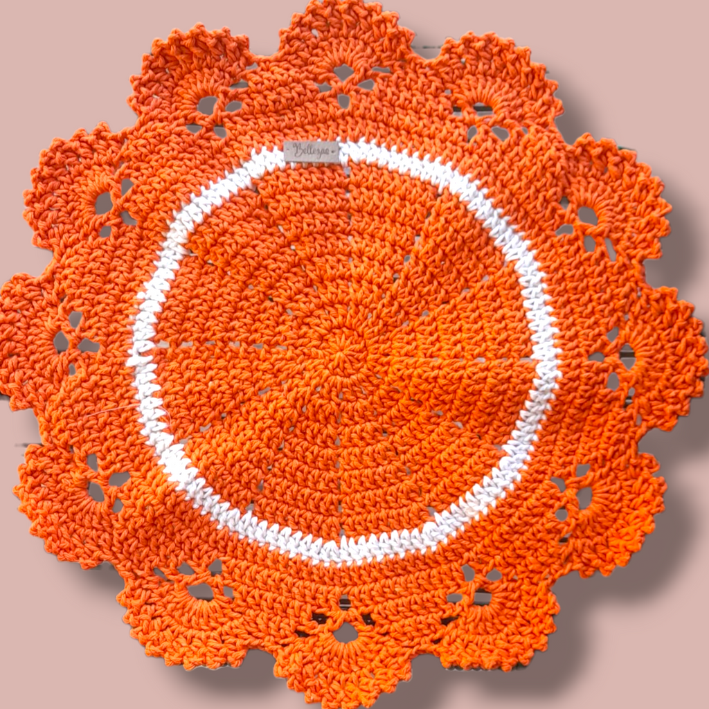 INDIVIDUAL DE MESA TEJIDO A MANO.Aporta calidez y estilo a tu mesa con este hermoso individual tejido a crochet en color naranja vibrante con detalles en blanco. Su diseño decora tu mesa con un toque artesanal y acogedor. Ideal para el comedor o para ocasiones especiales, elaborado con hilos resistentes de fácil lavado. Perfecto para quienes aman los detalles únicos y hechos a mano.Características:Material: hilo de algodón de alta calidad.Medidas: 40 cm de diámetroColor: Naranja Intenso con detalles en blanco.Hecho a mano.EMPAQUE: EN CAJA DE 4 INDIVIDUALES, (con instrucciones de lavado)
